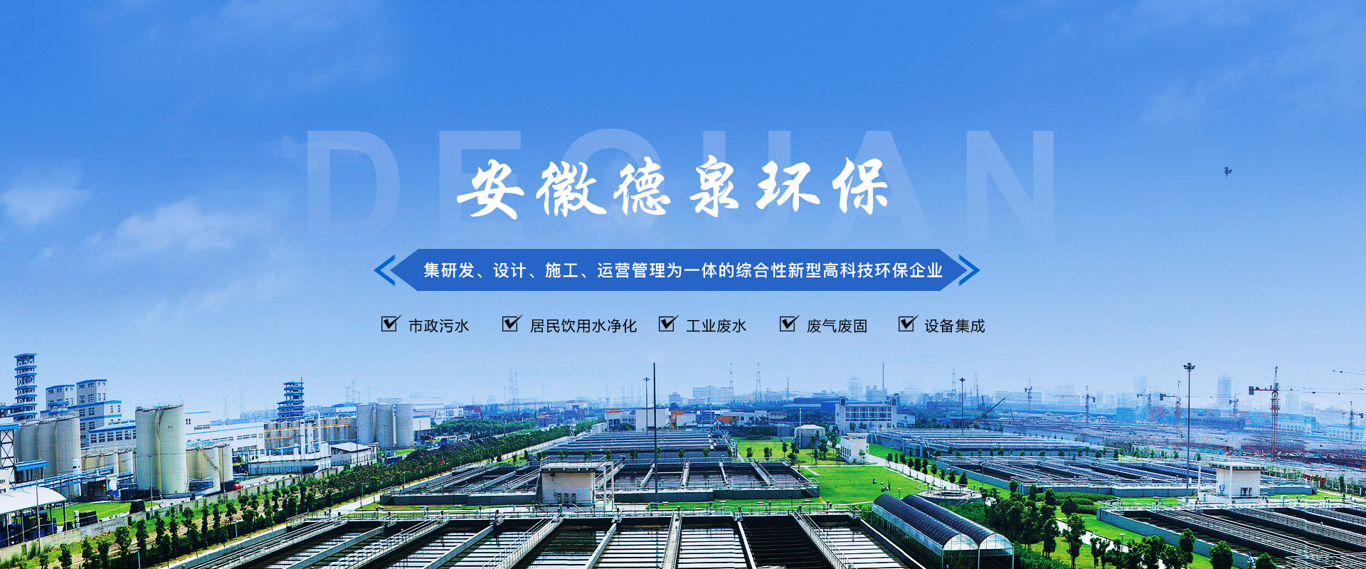 安徽德泉環??萍加邢薰局铝τ趶U水、廢氣、固廢技術處理研發、設計、施工及運營管理,從事環保設備及設施的制造和銷售,為環保項目系統提供專業的技術咨詢和服務。是一家集建筑勞務分包,工程總承包(EPC)、項目投資(BOT/PPP)、運營管理(O&M)于一體的綜合性新型高科技企業。